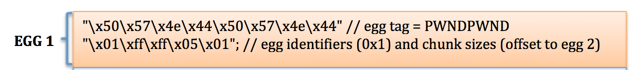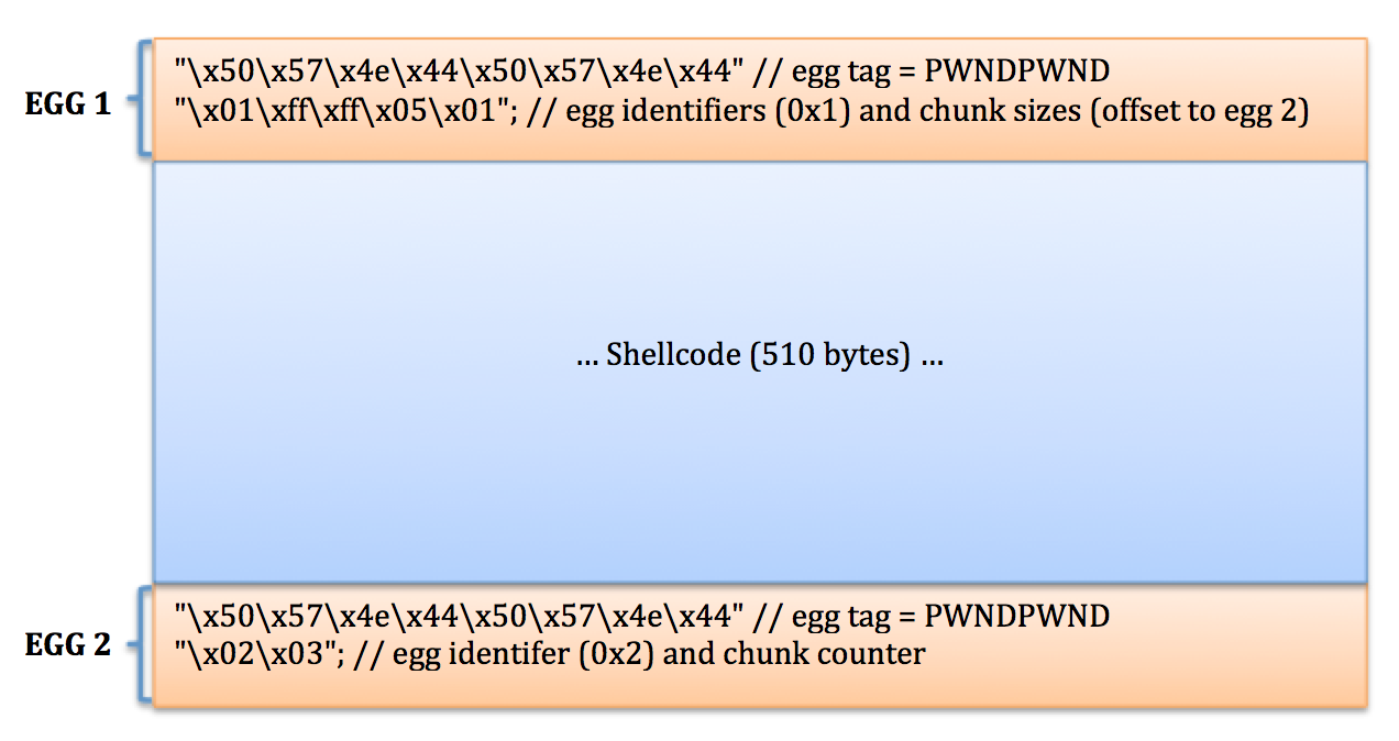 Let’s assume you have a shellcode payload of length 510 bytes and you’re using an egg tag of PWND. Your payload would look as follows: