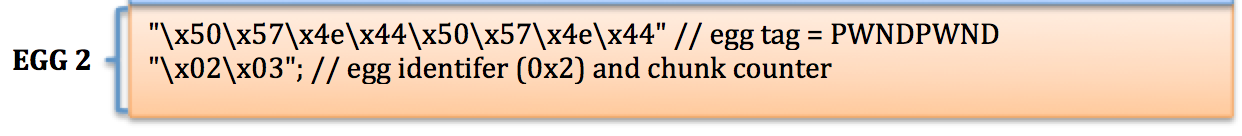 The Egghunter checks the register holding the updated address for the presence of the second egg and if it finds the correct tag (PWNDPWND), it checks the next byte (0x2) to verify its found the second egg and not the first. The byte that follows (0x3) indicates the total number of offset bytes from tag 1 (0xff, 0xff, 0x5).
