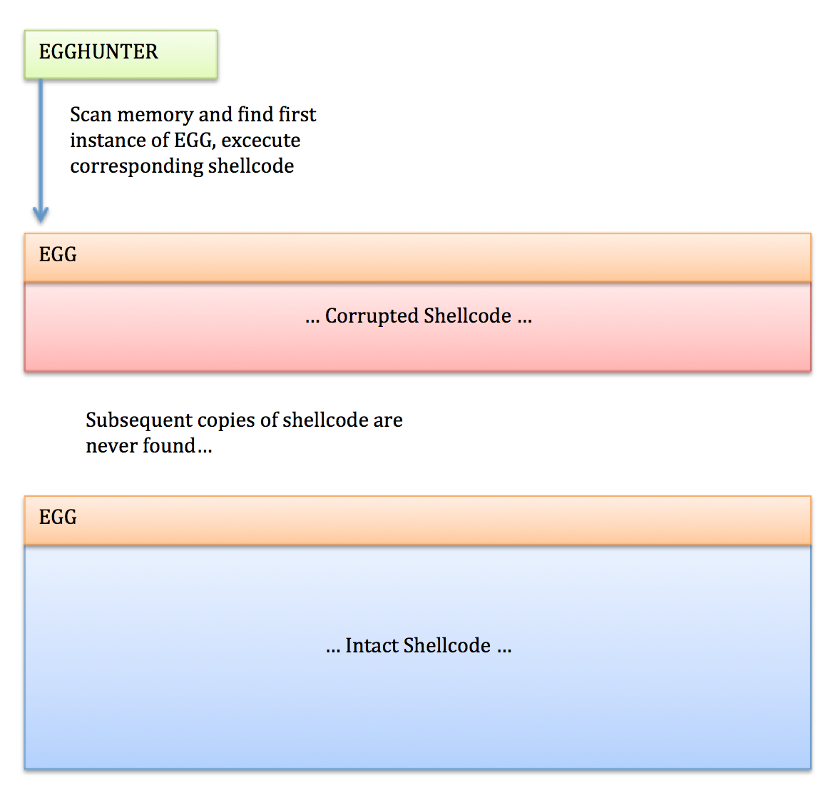 Now let’s say the next egg the Egghunter comes across in memory is the second one (due to another corrupted copy of shellcode). It would check the integrity byte against the value in ECX and fail the check, at which point it would move on to the next egg and skip the corrupted payload altogether. Here is a generalized flow diagram so you get a high-level idea of how it works before diving into the code: