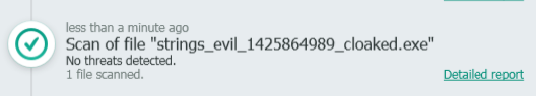 This product successfully detected all four uncloaked test files. I successfully evaded detection for strings_evil.exe and vdmallowed.exe using default settings.