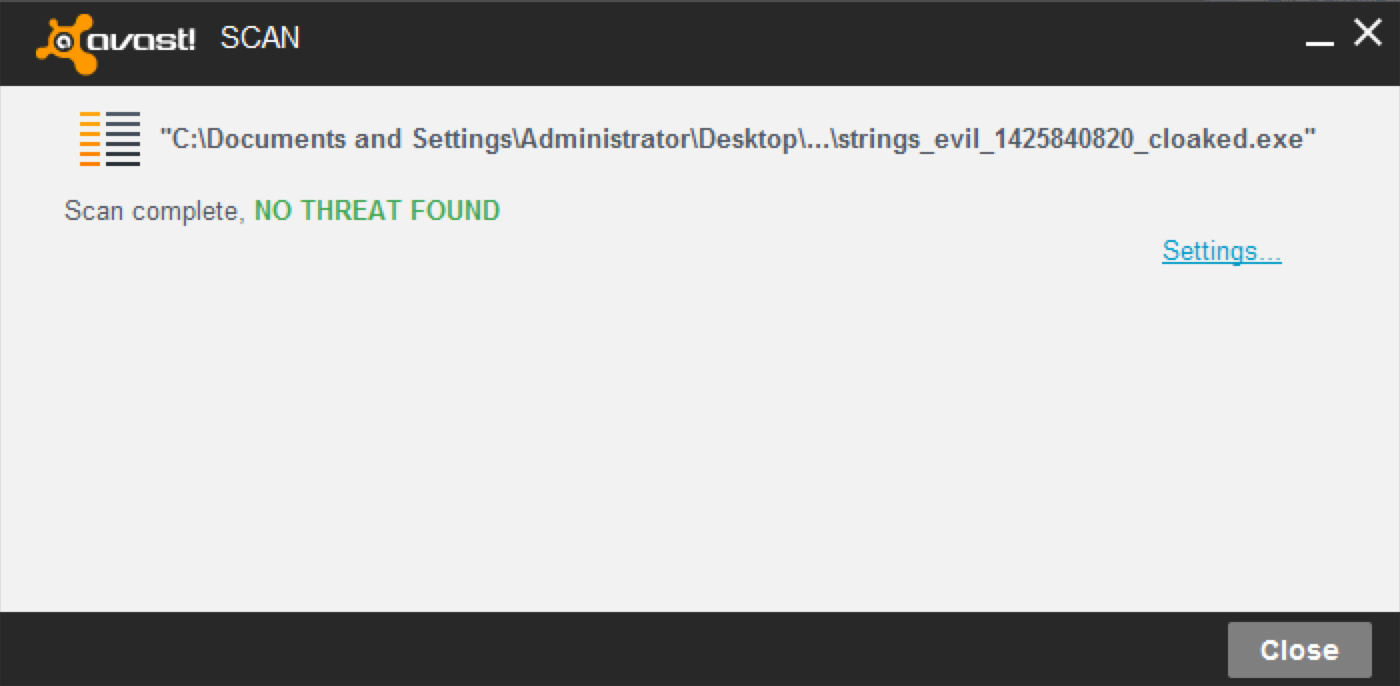 For example, in at least one of these AV products, the signature detection was the result of bytes contained within the PE Header, which my script does not attempt to modify. A quick glance at the table, will demonstrate that despite a few of the products detecting some of the executables, the best method of evading AV detection is by cloaking a backdoored executable (as I did with strings.exe). In fact, as you’ll see below, one of the products actually automatically whitelisted my backdoored executable without any action on my part!