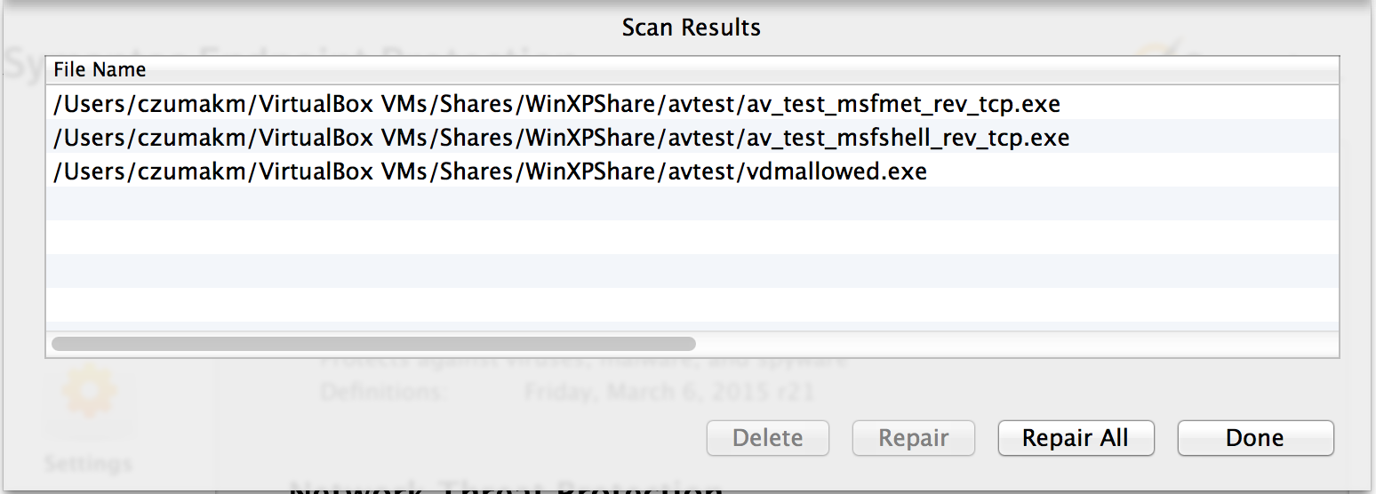As stated previously, testing of SEP was the only AV product tested on a Mac client (simply because I already had it installed). This product did not detect the pre-cloaked strings_evil.exe so additional evasion was not necessary. The remaining three pre-cloaked test files were detected.